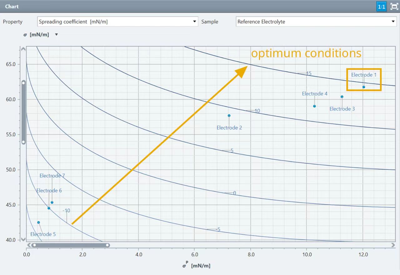 如果我们刚刚谈到SFT和湿润之间的直接关系,这仅仅是故事的一半。主导润湿的界面化学相互作用也取决于电解质和电极材料的极性。借助于更深入的研究,可以根据接触角和电极材料的表面自由能(SFE)更精确地记录这些相互作用。某种程度上更大的努力是值得的。例如,根据表面自由能及其极性分数,可以计算出电解质或电极材料的哪些特性会导致最佳的润湿。与其用试错法进行研究,不如根据有意义的结果参数,有针对性地优化润湿。